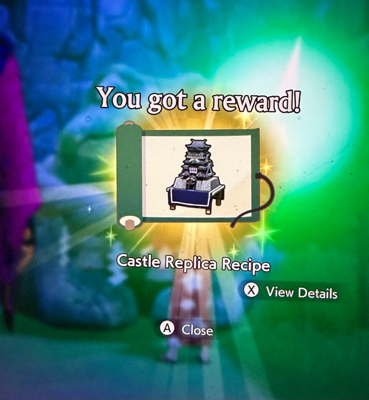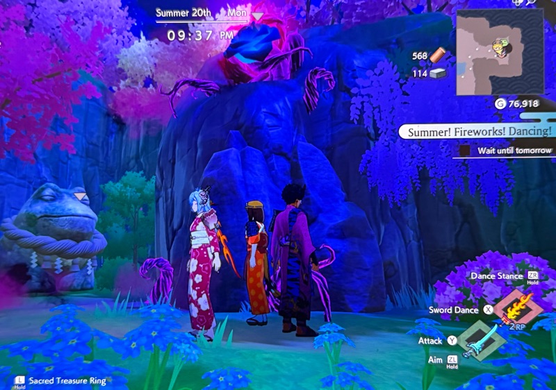 There is a gold pin at the Spring Dragon Shrine. I go there and walk out the door for an event with Iroha. She has made her own Sacred Treasure for me: Iroha's Fan.
