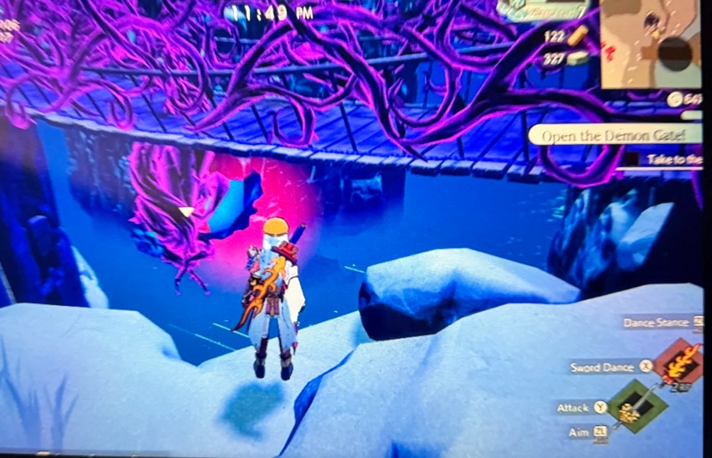 I drop down to face one more red blight and there is wateraze. He laughs and says he forgot to menrion that additional watering hole. We suspect the omission was deliberate but why? There is red blight I must clear to enter the vortex leading to the next area. A new save point to the left: to White Wolf Mountain.