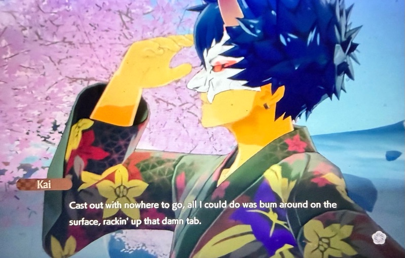Kai is much misunderstood and a part of that is his own fault, although in fact he behaved no differently from the other gods after the Celestial Collapse. Where they took refuge in their shrines or hid like Ulalaka in a dying tree, Kai sat in plain view at Yachi’s, but refusing to interact with any one but Yachi herself. He actually is one of the most sociable of the gods and many of his conversations allude to that. He speaks of social events and drinking with others rather than drinking alone. Yet, masked and uncertain of his place either in the world of the Oni or the world of humans, he was seen alone for a very long time.