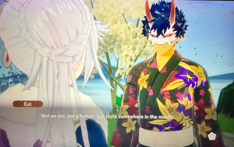 Kai is half human, half Oni. I would love to know that story, but the masque he wears in Azuma is that of a proud and fearsome Oni. When he removes it, you see the face of a very pretty youth. Yachi will tell you that he is ‘a timid little god’. He is a very kind one as well, and I think the masque offers him a little protection from those who might perceive compassion as ‘weakness’. His brusque manner conceals a very big heart. He is a loyal friend. In one event, he protects Cuilang from violence even though Cuilang could repair any damage himself that he might suffer.