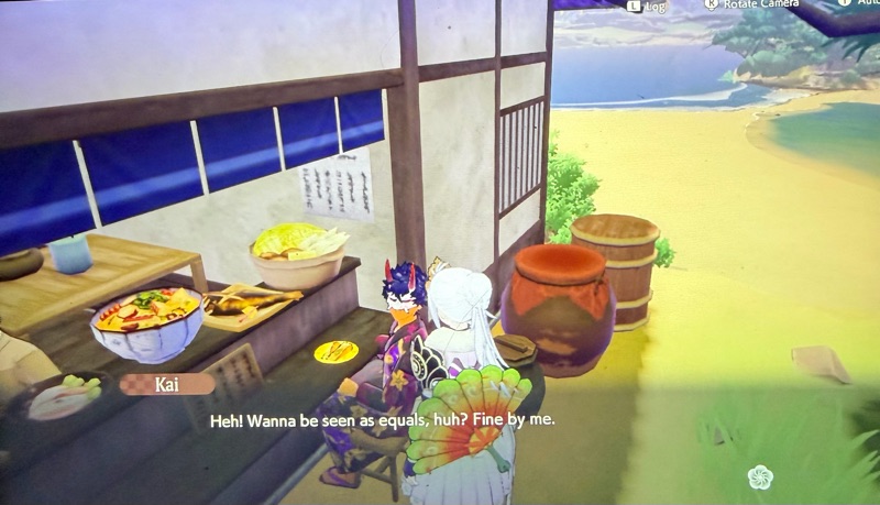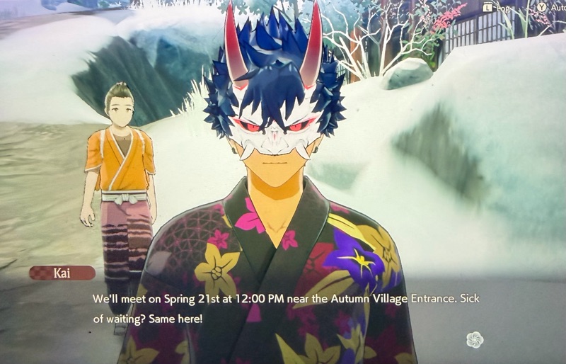 I cannot be without him. I feel his absence deeply if the story forces his absence or I am married to another. I began the story again so I could go through those early days when he would not interact, and then experience his enthusiasm about the Mikoshi Melée. Finally I am experiencing those early bonding events again. The moment when he joined my Party for the first time to take me to the Underworld… and we went through those blighted corridors together, just hearing his voice made me smile although I know all of the dialogues he uses in battle with me and with most of the characters. When we reached Ura finally, I was not as strong as I might have been had I waited another day or two. We stood and fought together against Ura and I had to use the drum to heal us both more than once. I was not paying enough attention and might have died in a second, so I went quickly to my inventory to eat something. My hand slipped somehow and instead of taking the food myself, it went to Kai. I hear his cheerful voice then: Time to chow down!