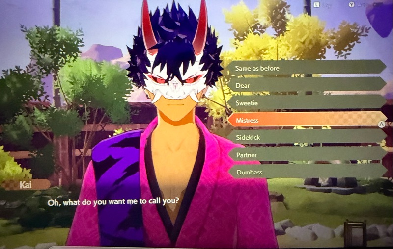 This may be one of my favourite moments in the game. For the sheer ‘hell of it’, I was testing nicknames with Kai. I decided to try ‘Mistress’ without any expectation that it would prove particularly interesting. And he surprised me as he so often can with his response. It made my day!