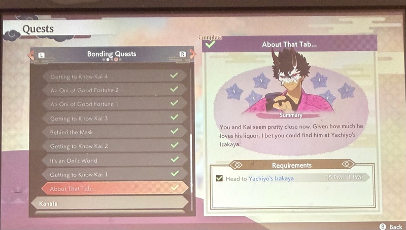 From this point, you will find Kai at Yachiyo’s every night, but will not be able to carry on a dialogue with him or raise his Bonding Level. You have many quests to complete before Kai enters the story as a character with whom you can interact fully.
