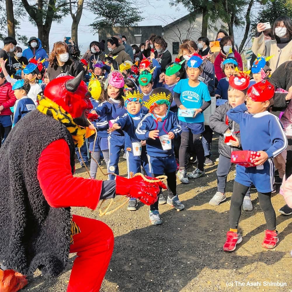 Kai allows the children to throw beans at him freely and shout: ‘Oni out! Good fortune in!’