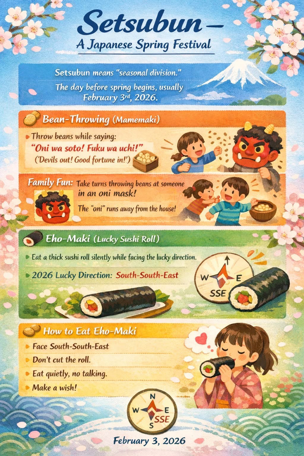 It is Setsubon in Japan now, when Spring is welcomed with bean throwing and chants of ‘Oni wa soto, fuku wa uchi ’. These are thought to drive away evil and invite good fortune.